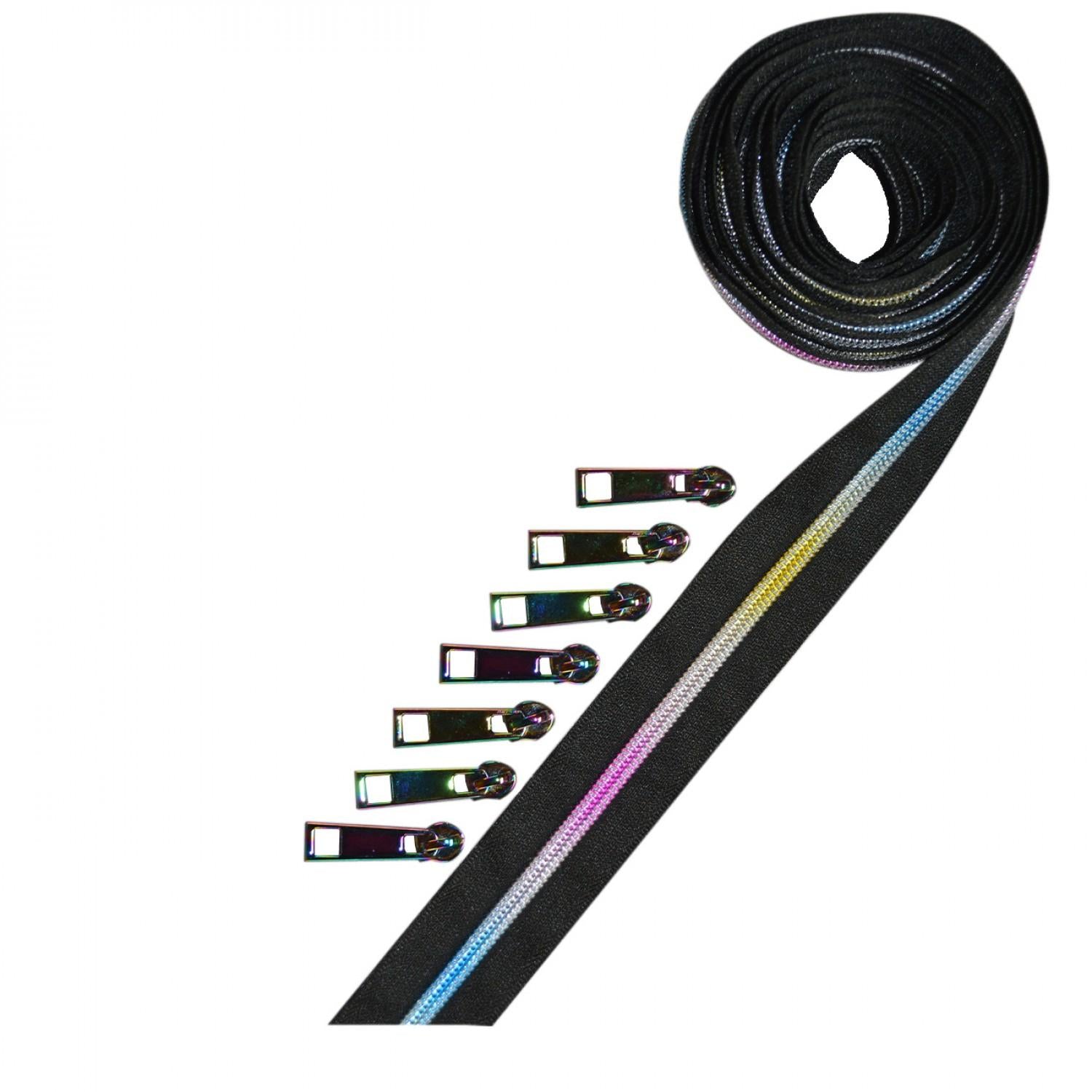 This 2 -1/2 yard package of #5 black zipper tape with 7 slides. The gold metallic teeth have the beauty of metal, with the ease of a coil that can be sewn through and cut through with out harming your scissors.