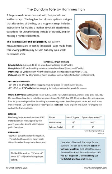 The Dundurn Tote is a large waxed canvas shoulder bag with three exterior and two interior pockets. The bag can be made with leather or webbing straps, and the pattern includes two different closure options.