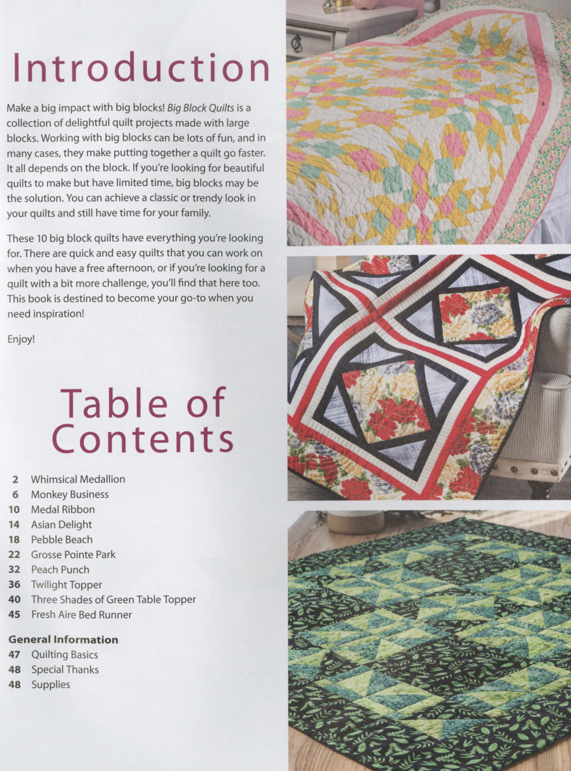 This is the time to discover quilts with big blocks. Cut your piecing time in half with these larger than life blocks. 10 unique projects to choose from in all skill levels. You'll find everything from table toppers to bed quilts. It's time to up size for and explore the newest trend in quilting.