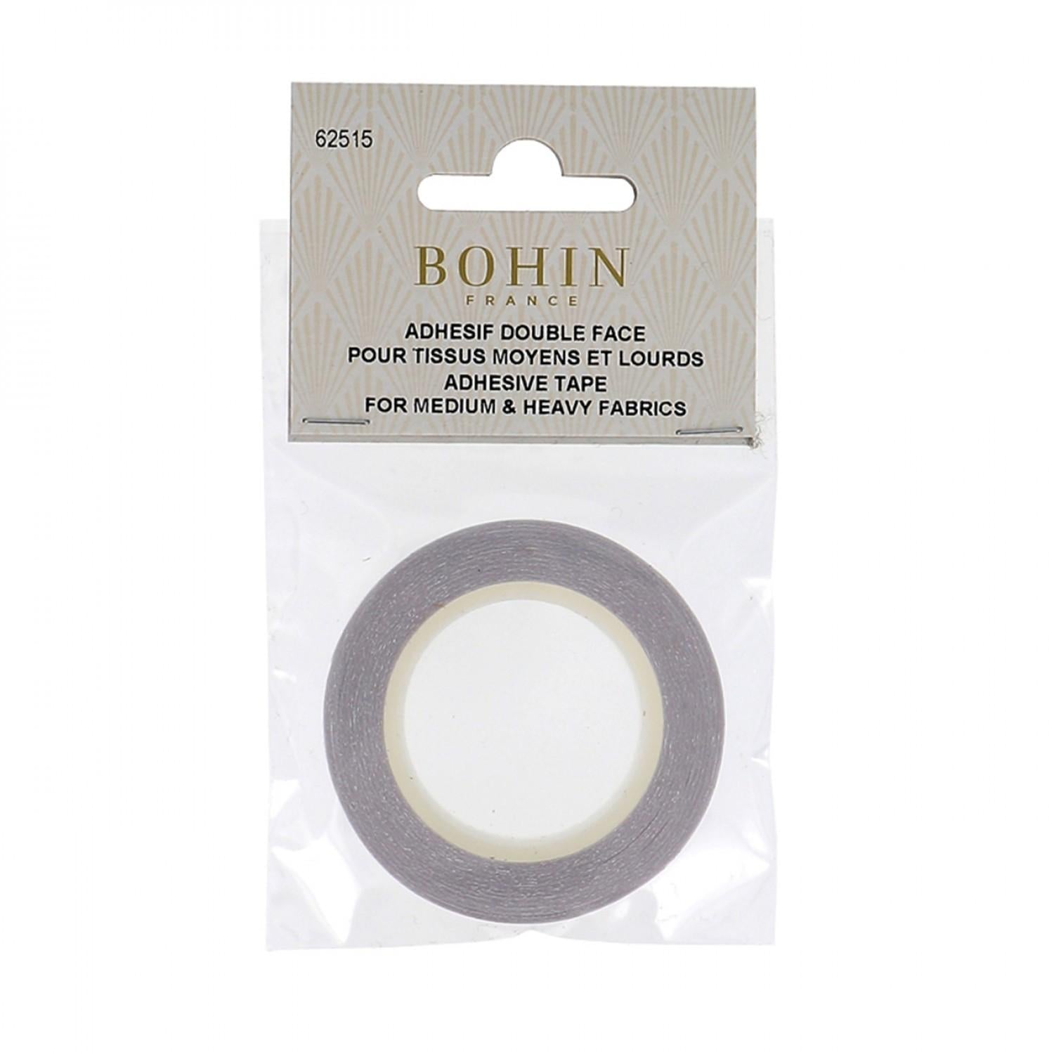 Bohin Double Face Adhesive Tape, 1/4 in. wide x 8 yards. For medium and heavy fabric, this double sided adhesive tape can be sewn through without gumming up your needle. Perfect for holding together seams, hems, edges etc. before stitching. Can be used on clothing; great for home, sewing or crafting.
