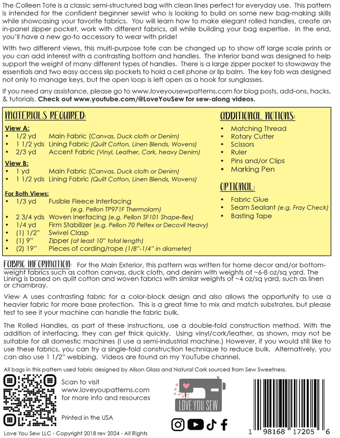 "The Colleen Tote is a classic semi-structured bag with clean lines perfect for everyday use. This pattern is intended for the confident beginner sewist who is looking to build on some new bag-making skills while showcasing your favorite fabrics. You will learn how to make elegant rolled handles, create an in-panel zipper pocket, work with different fabrics, all while building your bag expertise. In the end, you’ll have a new go-to accessory to wear with pride!
