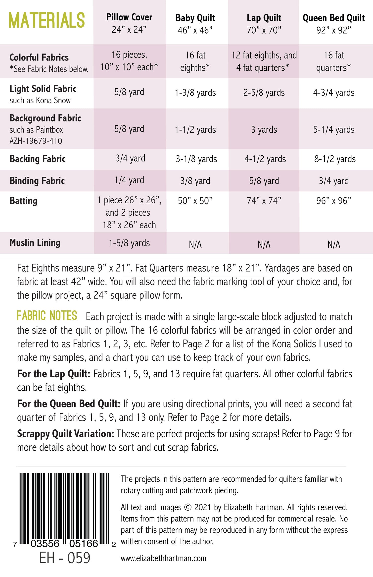 Crystal Cluster includes instructions for making the same bold starburst quilt design in three sizes, plus a pillow. Everything is made using conventional patchwork techniques. No templates or paper piecing! This is a perfect project for featuring your favorite colors and prints, and the pattern includes a detailed color chart that can be used to duplicate the fabrics I used, or as a guide for organizing your own fabrics. Instructions for using scraps are also included.
