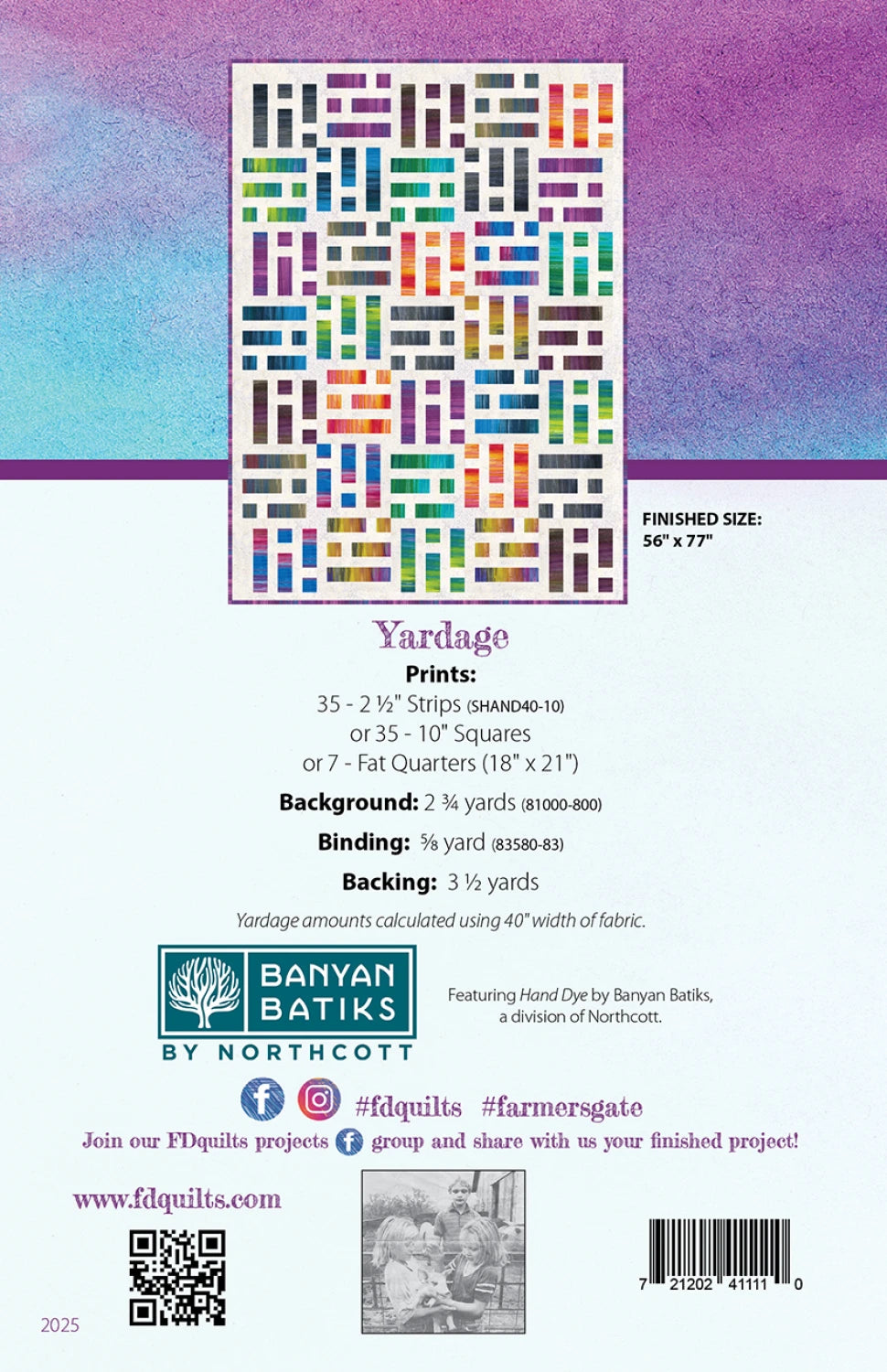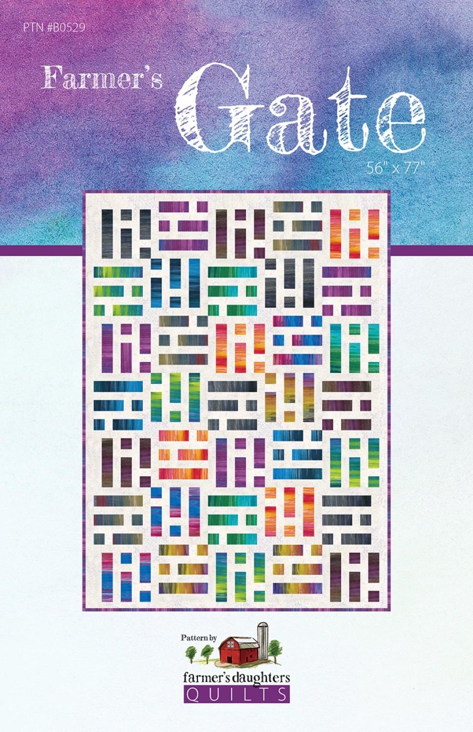 Farmer's Gate is a precut friendly pattern, making it easy to kit. The pattern uses either 35 - 10" squares (one layer cake) or 35 - 2.5" strips (one jelly roll) or 7 Fat Quarters with additional yardage for the background and binding. This pattern showcases a collection beautifully and finished at 56" x 77"! The pattern is printed in full color with easy-to-follow instructions and graphics.