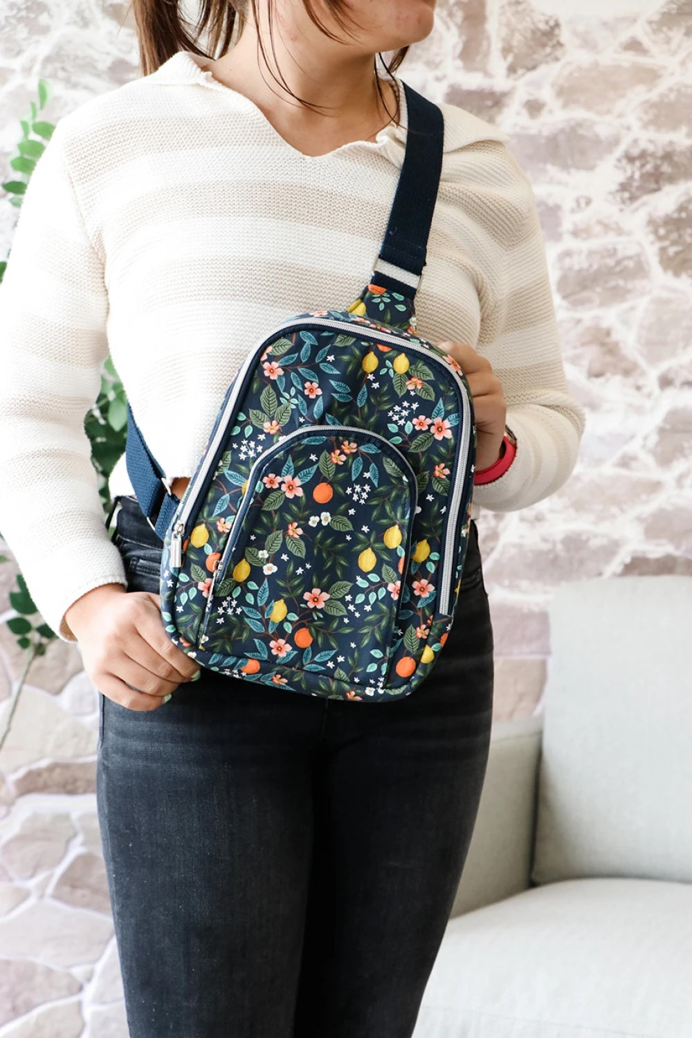 This modern mini sling bag will become your new go-to for all that you do! The asymmetrical design carries weight close for all-day comfort. The front zipper pocket provides easy access to a phone or other essentials. The interior mesh pocket and optional key clip allows for even more organization. As a bonus feature, the Traveler bag (LST276) fits perfectly inside! It has been a pleasure to design this pattern in collaboration with the iconic quilter, author, and educator, Jenny Doan of Missouri Star Quilt Company! Finished size: 8-1/2"" wide, 11"" high, and 2-1/2"" deep."