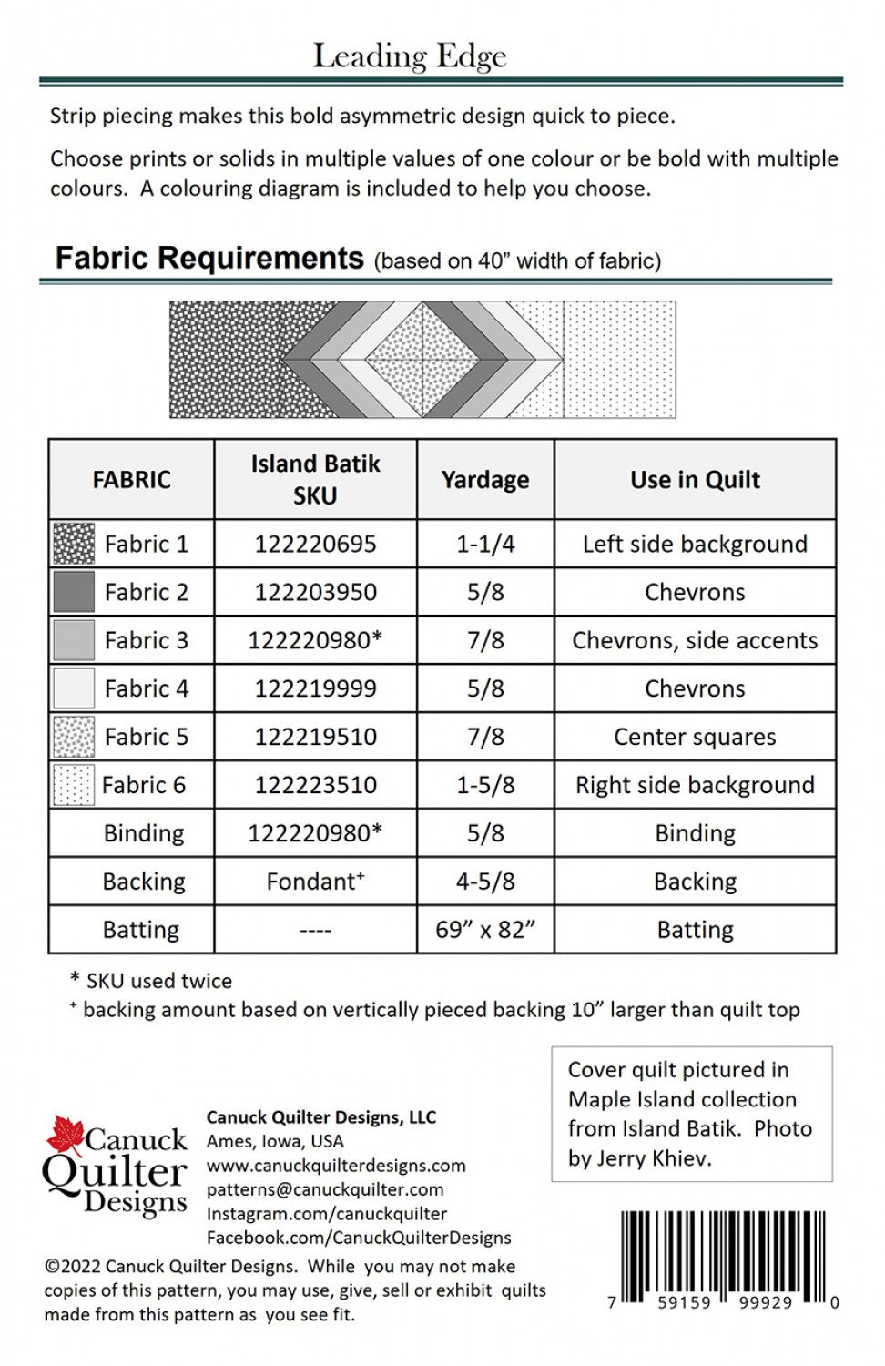 Strip piecing makes this bold, modern asymmetric throw quilt quick to piece. Choose prints or solids in multiple values of one color or be bold and use multiple colors. A coloring diagram is included to help you choose. Pattern includes tips and guidance on sewing with bias edges. Quilt measures approximately 59 in. x 72 in.