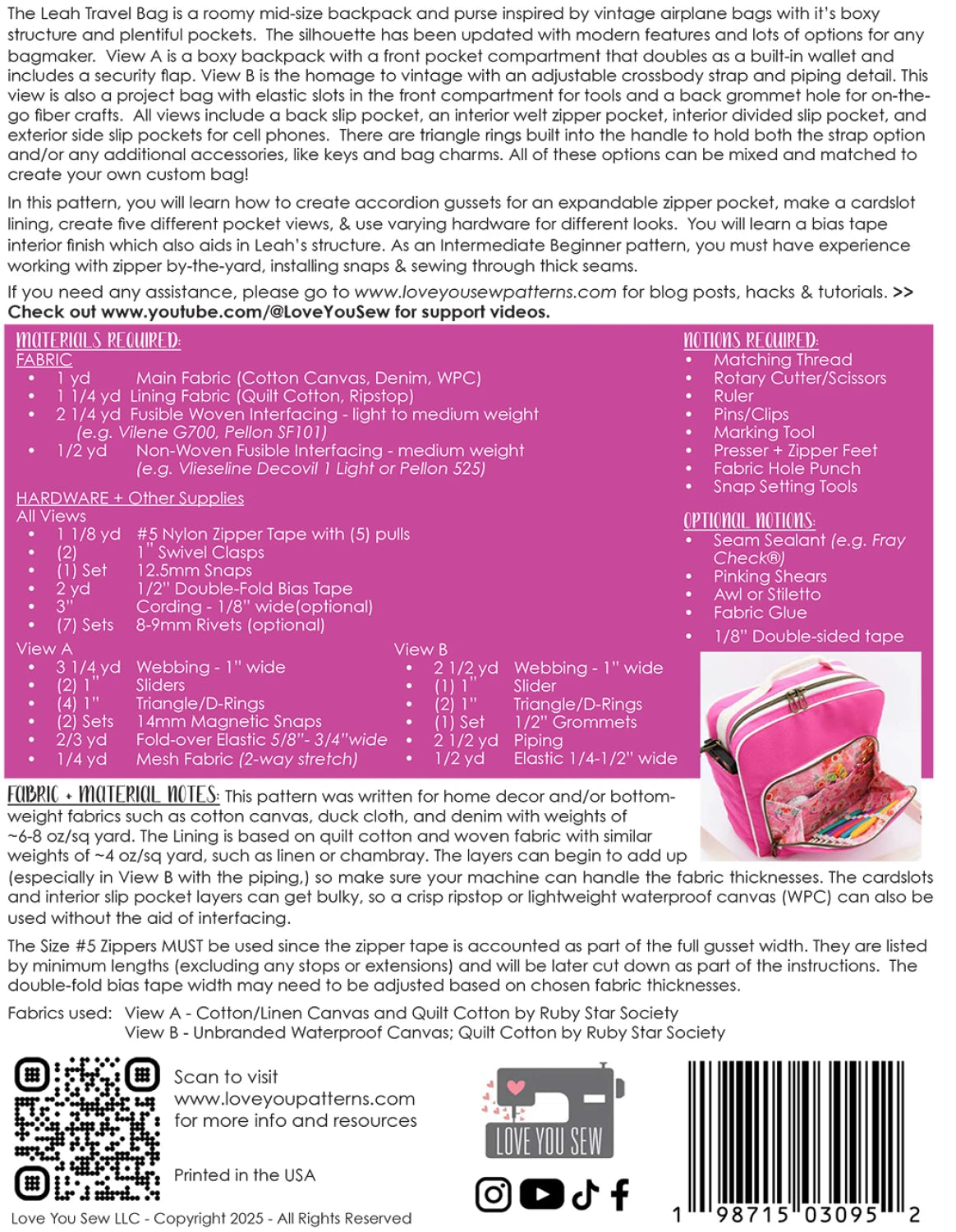 In this pattern, you will learn how to create accordion gussets for an expandable zipper pocket, make a cardslot lining, create five different pocket views, & use varying hardware for different looks. You will learn a bias tape interior finish which also aids in Leah’s structure. As an Intermediate Beginner pattern, you must have experience working with zipper by-the-yard, installing snaps & sewing through thick seams.