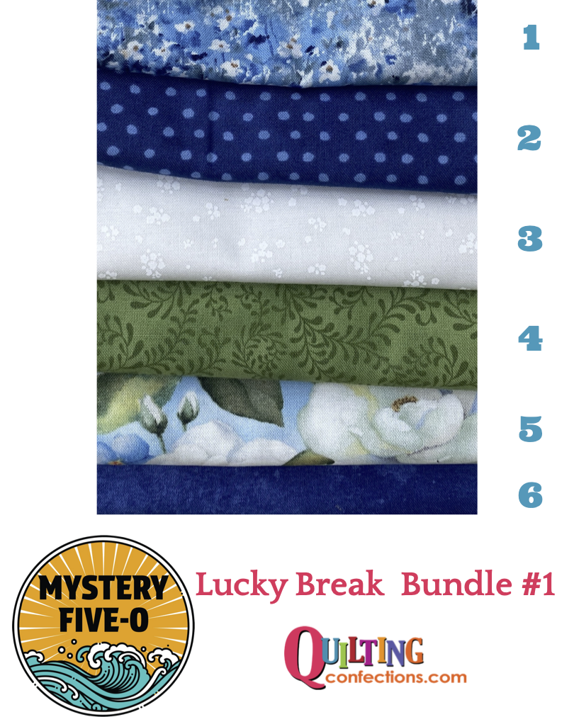 All the fabric needed to complete the top and binding of the next Mystery Five-0 Mini Mystery, Lucky Break! We decided to cut (6) quarter metre pieces for these kits.