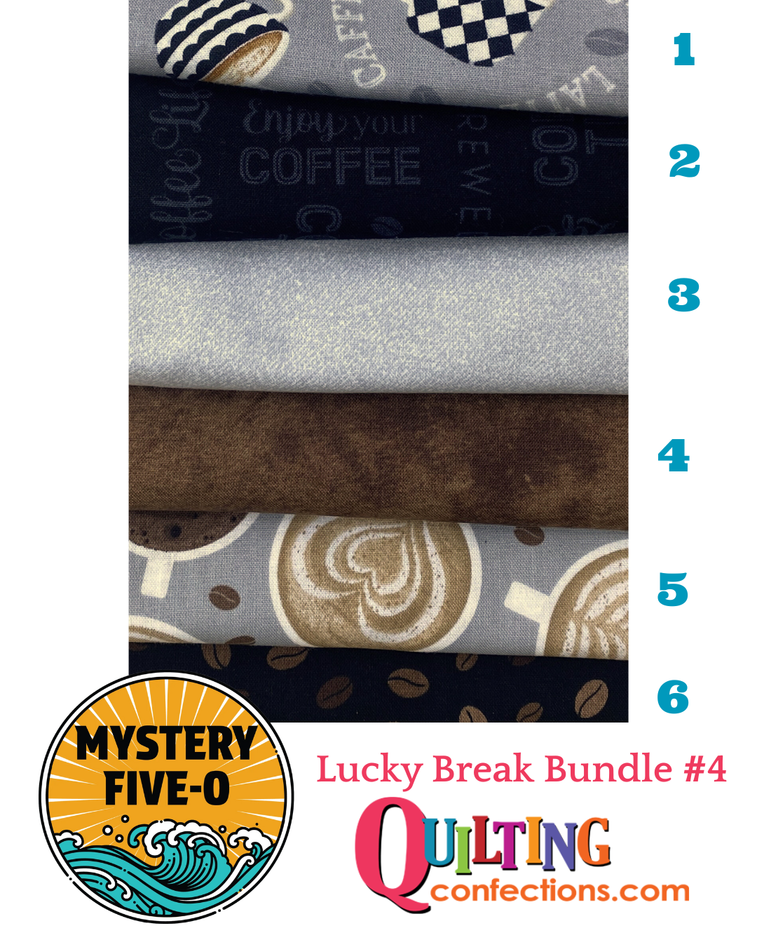 All the fabric needed to complete the top and binding of the next Mystery Five-0 Mini Mystery, Lucky Break! We decided to cut (6) quarter metre pieces for these kits.