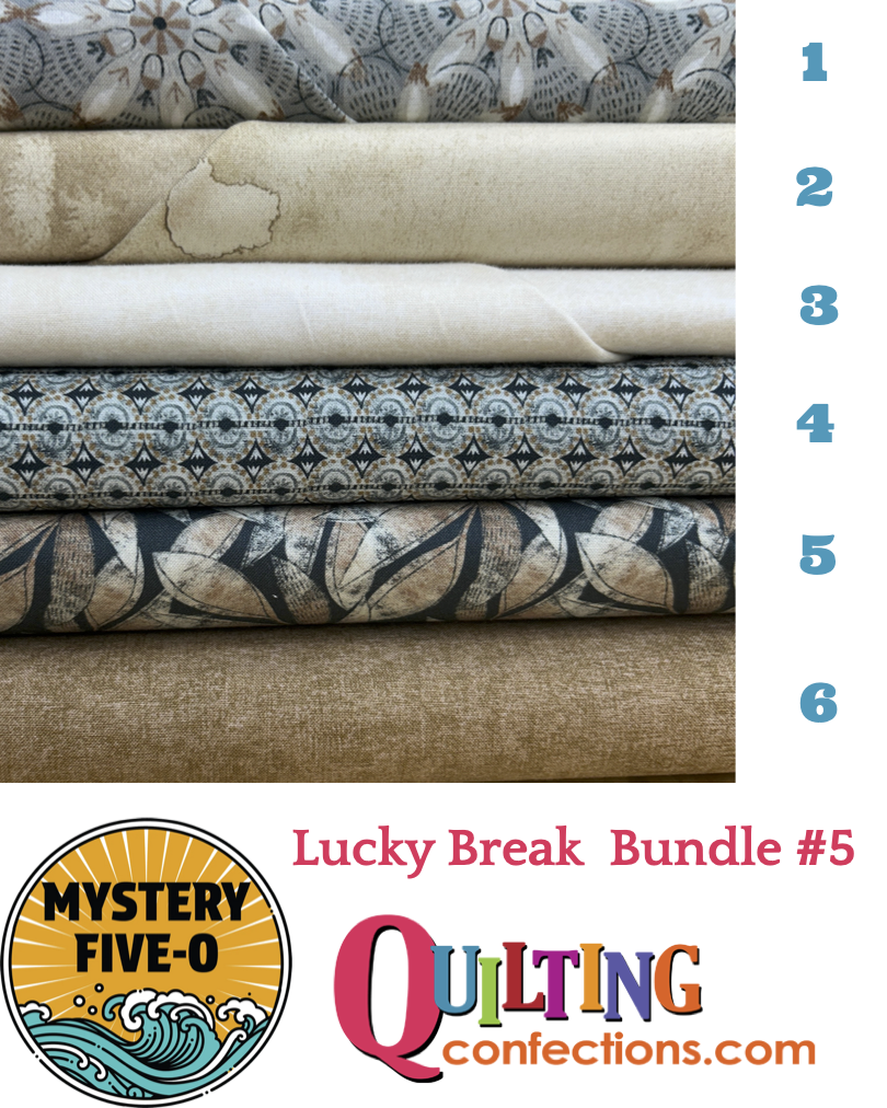 All the fabric needed to complete the top and binding of the next Mystery Five-0 Mini Mystery, Lucky Break! We decided to cut (6) quarter metre pieces for these kits.