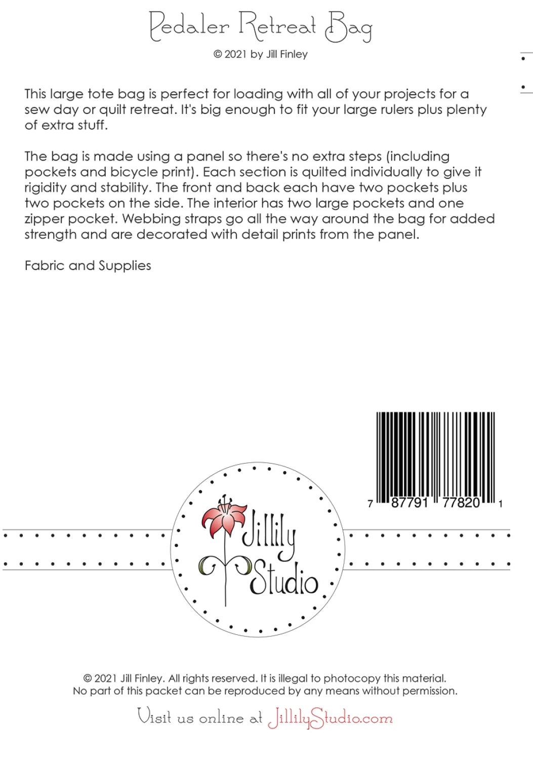 Finished Size: 18in x 25in x 8in This large tote bag is perfect for loading with all of your projects for a sew day or quilt retreat. It's big enough to fit your large rulers plus plenty of extra stuff. The bag is made using a panel so there's no extra steps (including pockets and bicycle print). Each section is quilted individually to give it rigidity and stability. The front and back each have two pockets plus 2 pockets on the side. The interior has two large pockets and one zipper pocket. Webbing straps go all the way around the bag for added strength and are decorated with detail prints from the panel.