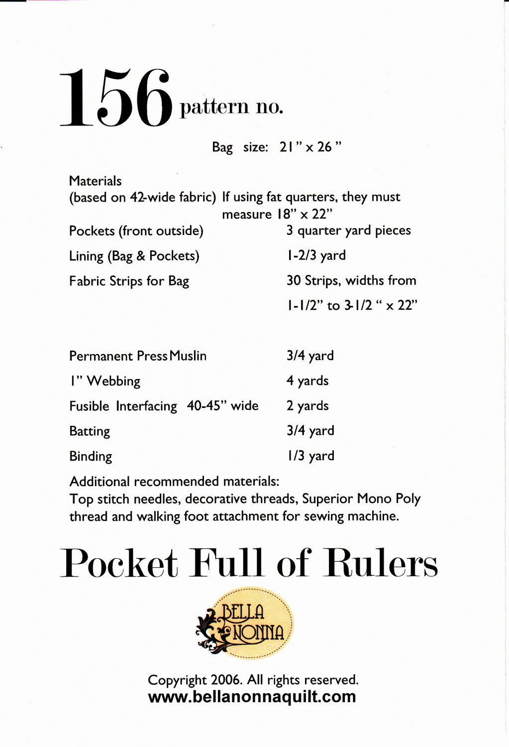 This bag holds rulers inside with custom pockets to fit all your specialty rulers. Three outside pockets hold 6" wide rulers of various lengths. The Pocket Full of Rulers bag was designed by a quilting instructor, Jerrine Kirsch for Bella Nonna and has been a hit with the quilting world! A great way to show off those decorative stitches on your machine.