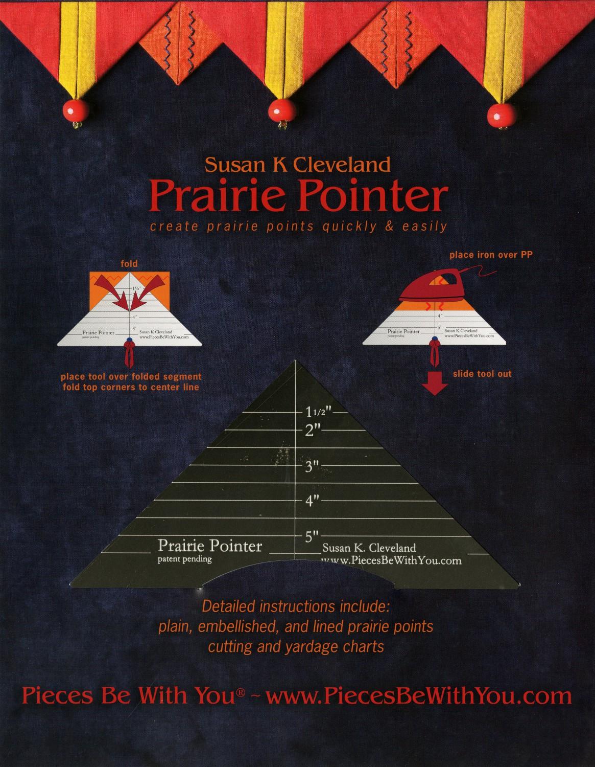 Making perfect prairie points has never been easier! Sometimes it's frustrating getting a sharp tip on a PP with all cut edges lining up perfectly, but the Prairie Pointer eliminates the frustration and produces perfect prairie points every time with a center fold, finishing from 1/2in up to 2 1/2in!