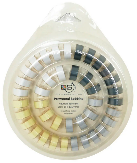 Select 80wt Para-cotton Poly thread makes for the perfect bobbin thread. These pre-wound bobbins have no resins or glues holding the thread to the bobbin for a clean sewing experience. The convenient case has a clear lid to keep dust off of the bobbins while leaving them visible. Each slot is labeled with the thread color to make matching easier.