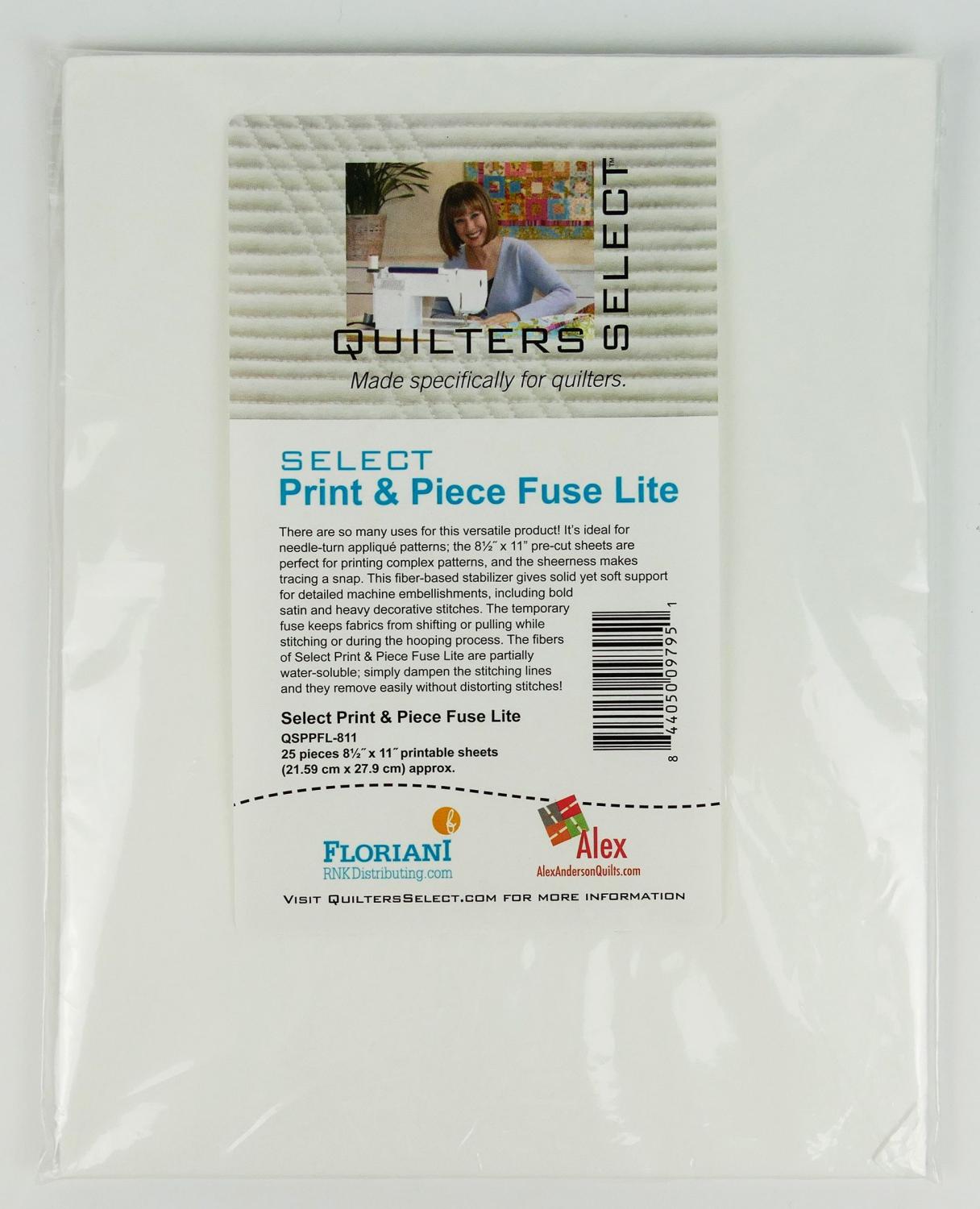 Ideal for turned edge applique and English paper piecing! This fiber-based foundation gives solid yet soft support for detailed or heavy stitching and the temporary fuse keeps fabrics from shifting or pulling. The fibers of Select Print & Piece Fuse Lite are partially water-soluble; simply dampen the stitching lines and the foundation is removed easily without distorting stitches.