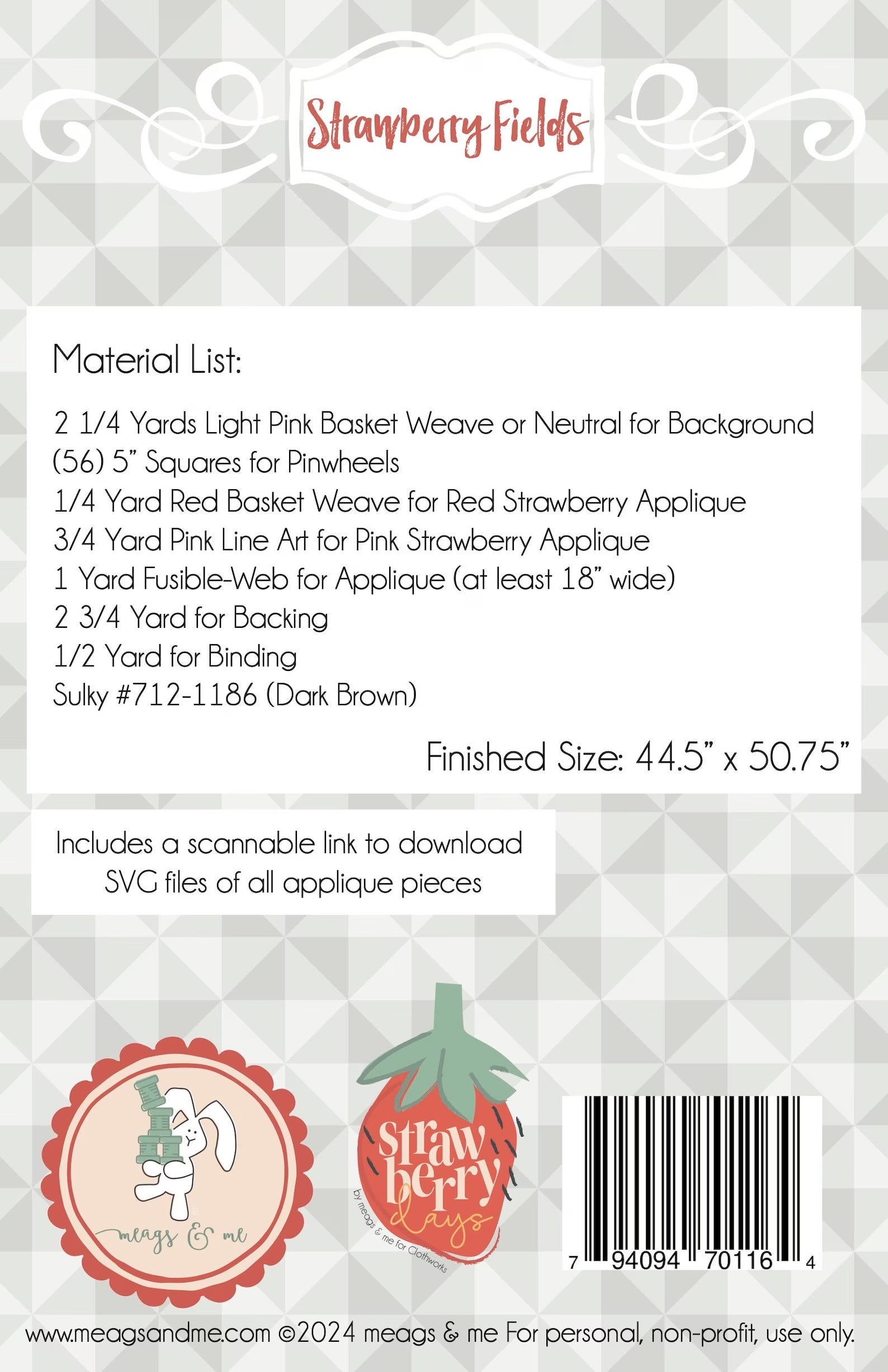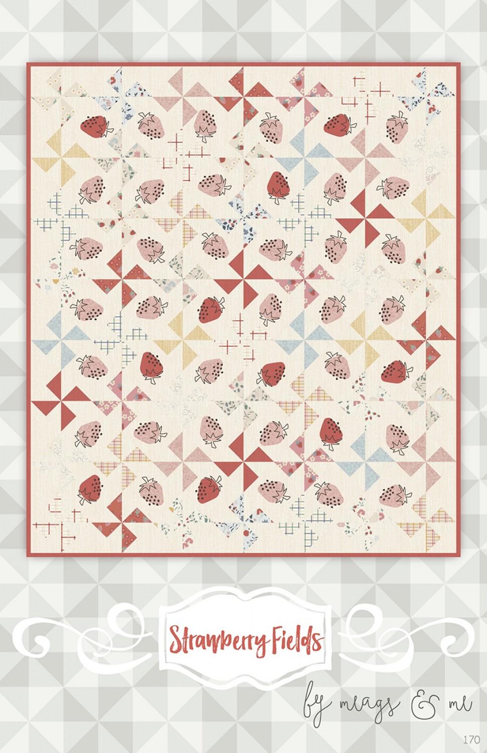 Charm pack friendly! A delightful fusion of pinwheels and appliqued strawberries with simple embroidery. Finished Size: 44.5" x 50.75"