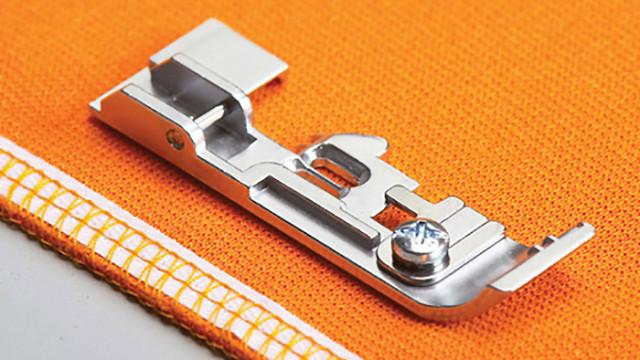 This specialty serging foot is for sewing on tapes. When a tape is sewn into the seam on stretch materials such as knitwear this will prevent the seams from stretching out of shape. This foot can also be used for applying narrow ribbons or trims.