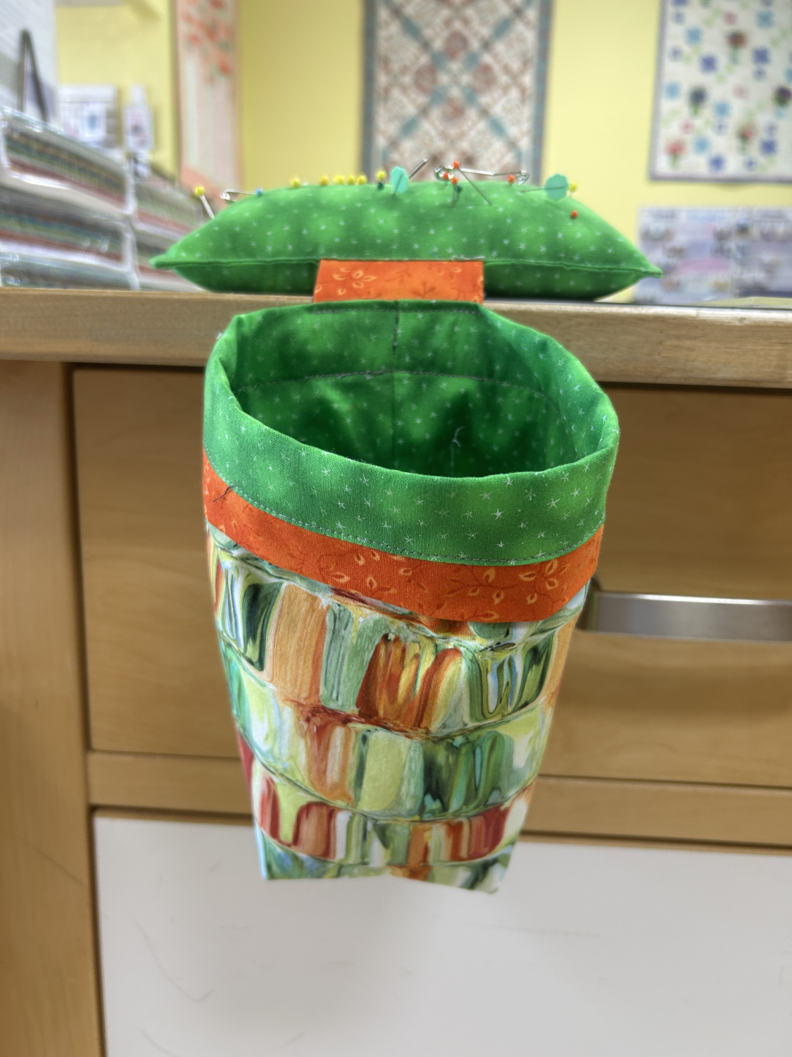 Make a thread catcher just like the ones in our classroom! Almost everything you need is included - fabric, boning and stabilizer. Just add filling to the pin cushion. There are a few different colours to choose from.