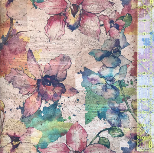 This is a custom print exclusive to MM Cork Supply! The large flowers are approx 5"x6" (13x15 cm) and printed on the smooth natural cork fabric. This print matches nicely with nearly every colour of cork fabric!